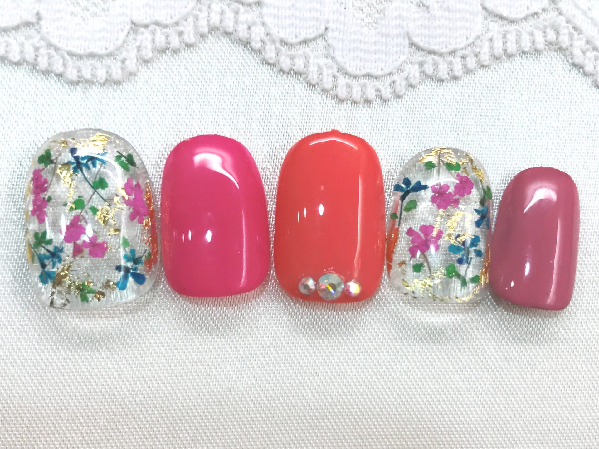 ショッキングピンク・コーラルオレンジ・スモーキーピンクのワンカラーに、ポイントで、クリアベースにピンクとブルーのドライフラワーとゴールドホイルを散らして。根元にはオーロラストーンをON。指先が明るく見える春らしいデザイン。