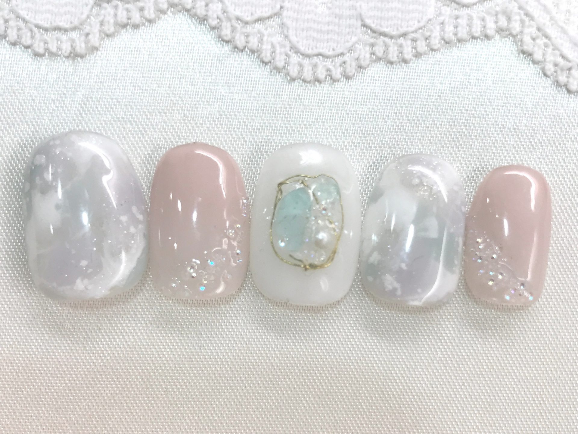 ヌーディーなダスティライトピンクのグラデーションに、ポイントで、ペールトーンのパープルとグリーン・ホワイトで、マーブルアートを。ゴールドワイヤーとライトブルーの天然石、パール、クリスタルピクシーをのせてボリュームアップ!根元にさりげなく入ったピクシーがキラッと輝く上品なデザイン。