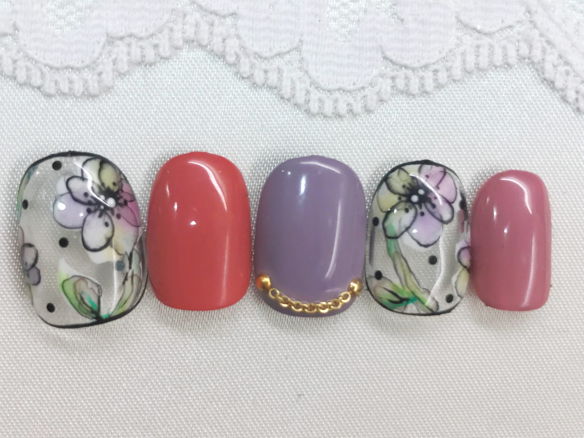 ダスティーコーラル・パープル・ピンクのワンカラーに、ポイントで、クリアベースにボタニカルフラワーのアートを。たらし込みアートの水彩画のようなタッチが可憐で素敵なデザイン。根元のゴールドチェーンでスタイリッシュに。