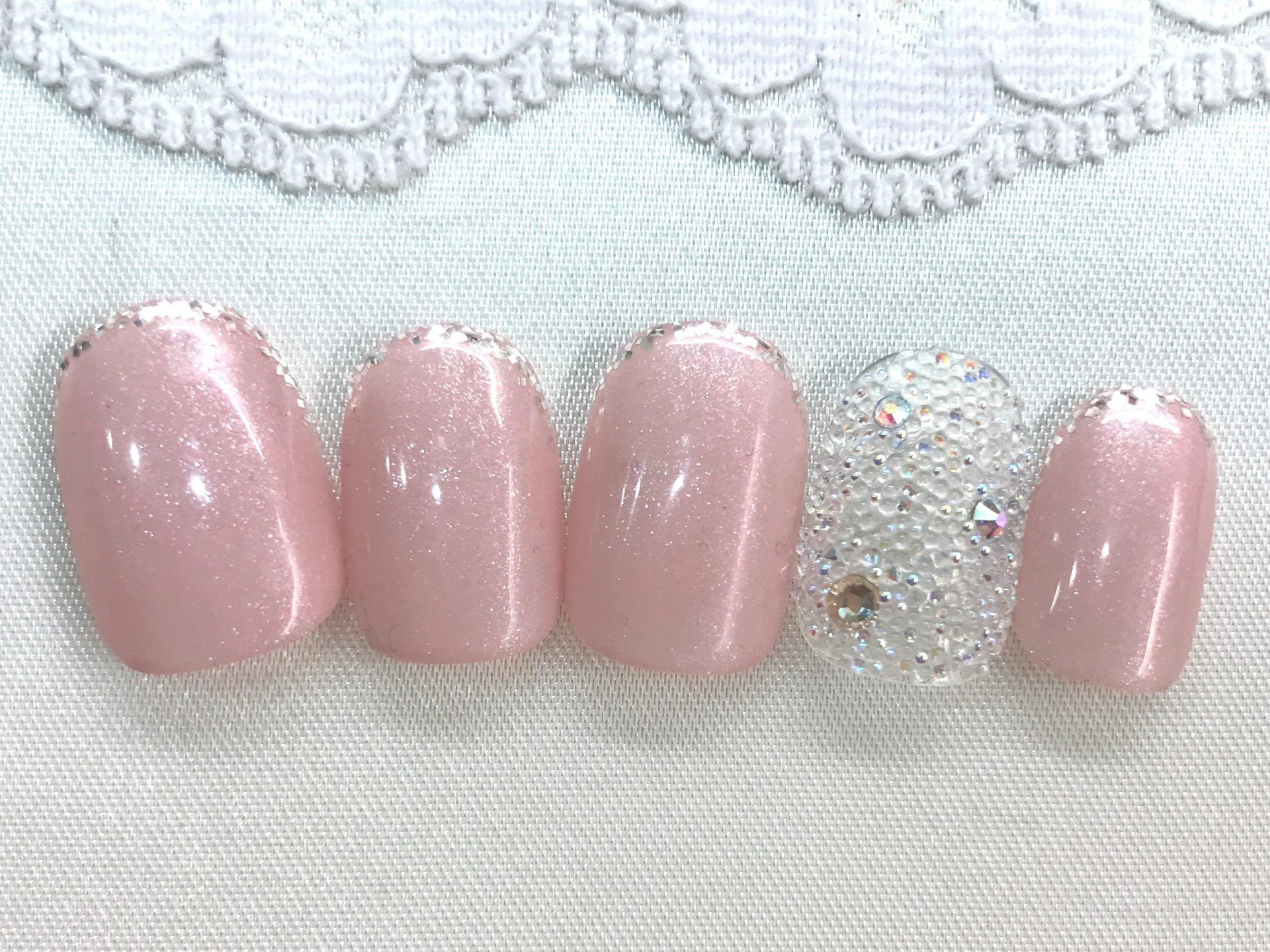 上品なピンクラメカラーにシルバーホログラムの極細フレンチ。ポイントで、大流行のクリスタルピクシーとストーンを散りばめて。今までのスワロフスキーストーンとは違う、ピクシーの輝きを是非お試しください!!