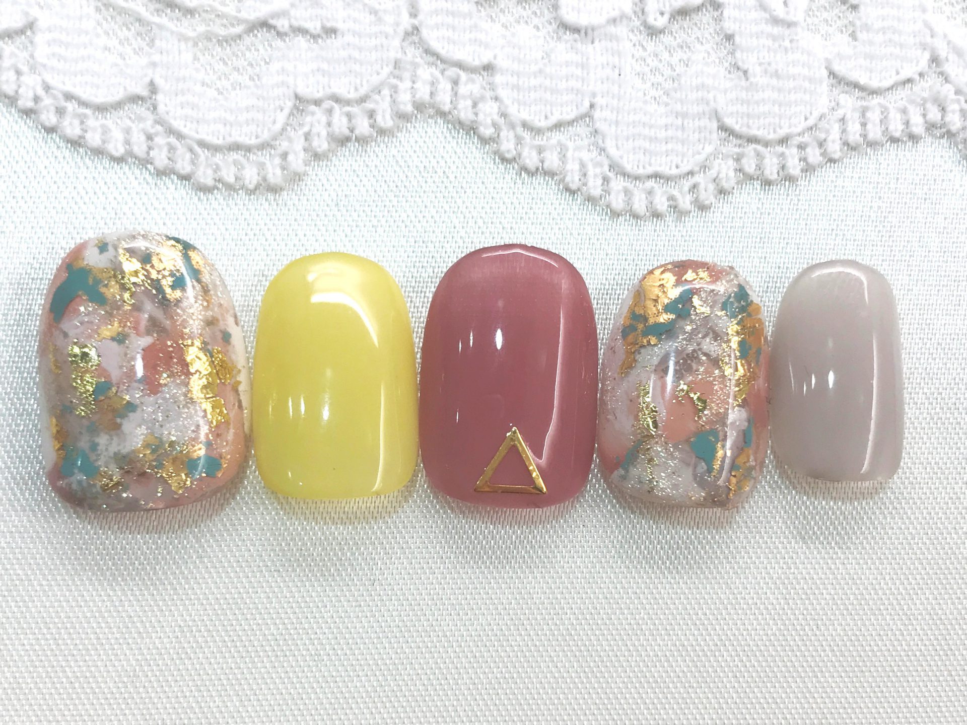 シアー感のあるイエロー・モーヴ・クレーのワンカラーに、ポイントで、幾重にも重なるカラーとホイルアート。くりぬきゴールドスタッズを根元にONして、お洒落上級者のニュアンスデザイン。