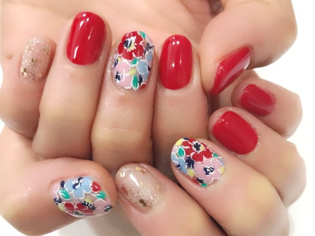 カラフルフラワー×レッドネイル
