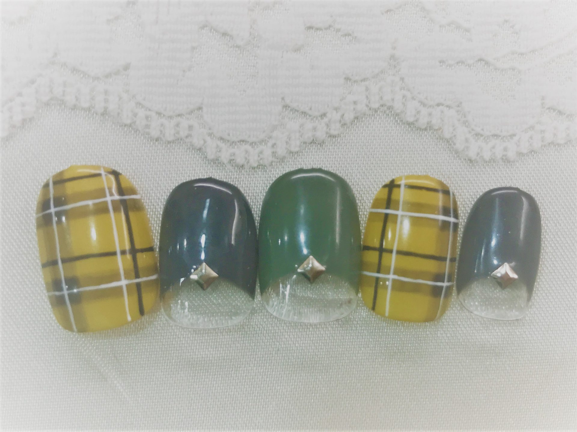 ダークグレーとカーキの逆フレンチの境目にシルバースタッズをON。ポイントで、マスタードイエローベースにブラックのチェック柄をペイント。クールな大人カジュアルファッションに合わせたいデザイン。