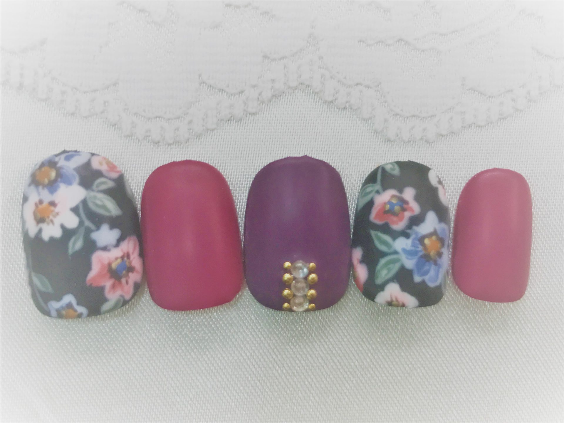秋らしいダークパープルとグレープパープルのワンカラーに、ポイントでブラックベースのフラワー柄をペイント。片手1本ずつに、クリスタルストーンとゴールドスタッズを縦にON。秋冬におすすめのマット仕上げがお洒落なデザイン。
