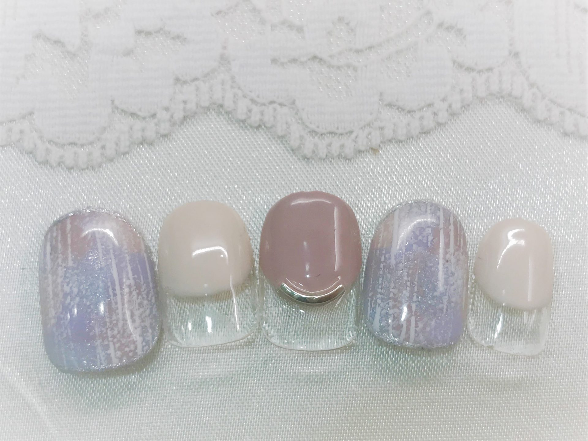 アイボリーとくすみパープルベージュのラウンドフレンチに、ポイントでベージュ・パープル・アイスブルー・グレージュの4色のタイダイベースにラフなストライプペイントを。片手1本ずつシルバーのカーブスティックパーツをのせて、シンプルだけれどオシャレなデザイン。