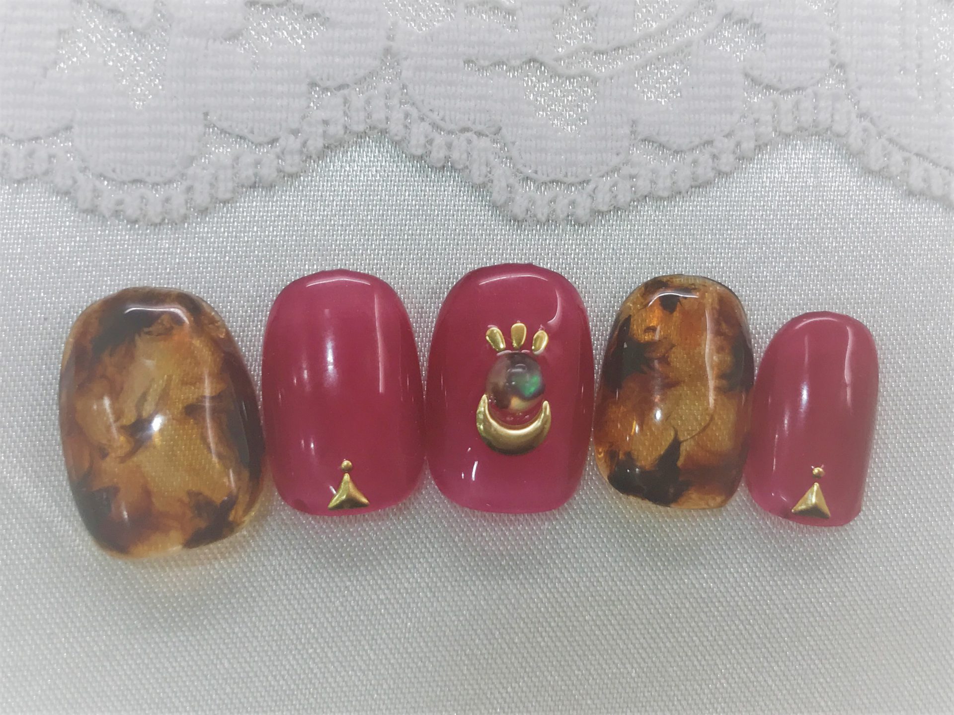 クリア感のあるボルドーカラーにシェルストーンとゴールドパーツをON。ポイントでべっ甲柄をペイントして、秋の定番デザインもシアー感を取り入れると今季風に。