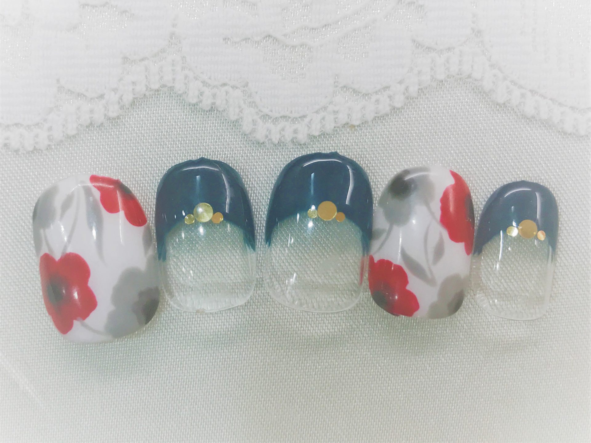 ダークグリーンカラーのフレンチにはゴールドホログラムをストーン風に。ポイントでホワイトベースにレッドとグレーのレトロ感たっぷりなフラワー柄ペイントは、大人可愛い秋デザイン。