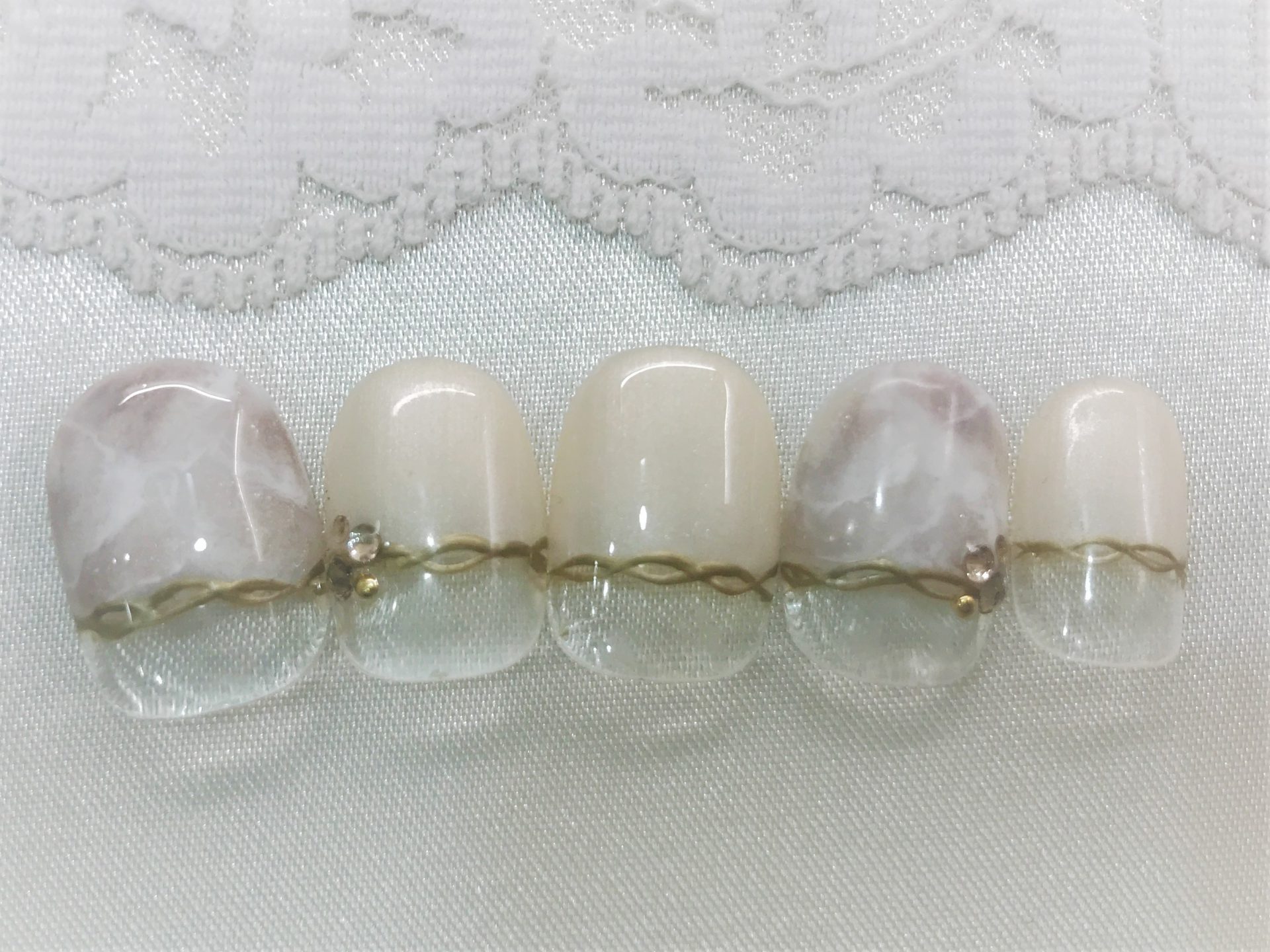 ほんのりパールの入った大人気のシャンパンカラーのブロックフレンチに、ヌーディーな大理石柄をペイント。メタリックゴールドのウェーブラインと、グレージュ・シルク・ライトトパーズストーン・ゴールドスタッズをのせて、シックで上品な大人の女性にぴったりなデザイン。